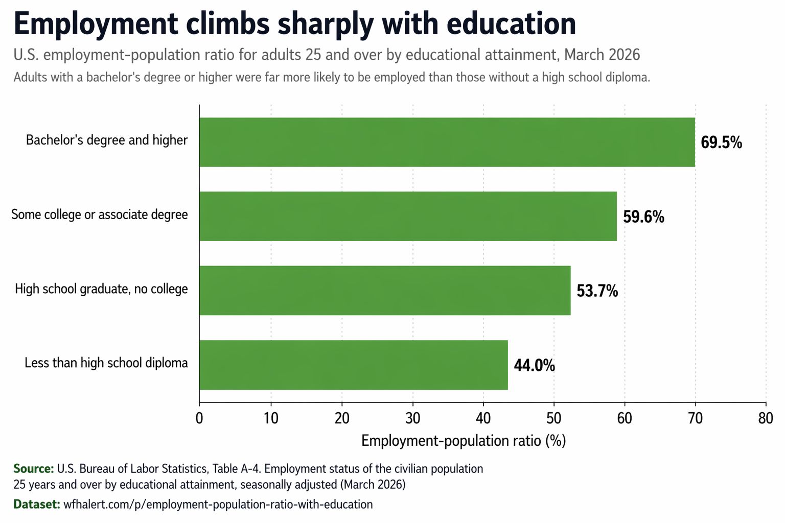 Employment outcomes in the U.S. rise sharply with higher levels of education. In March 2026, the employment-population ratio shows a strong upward pattern from the least educated to the most educated groups.
