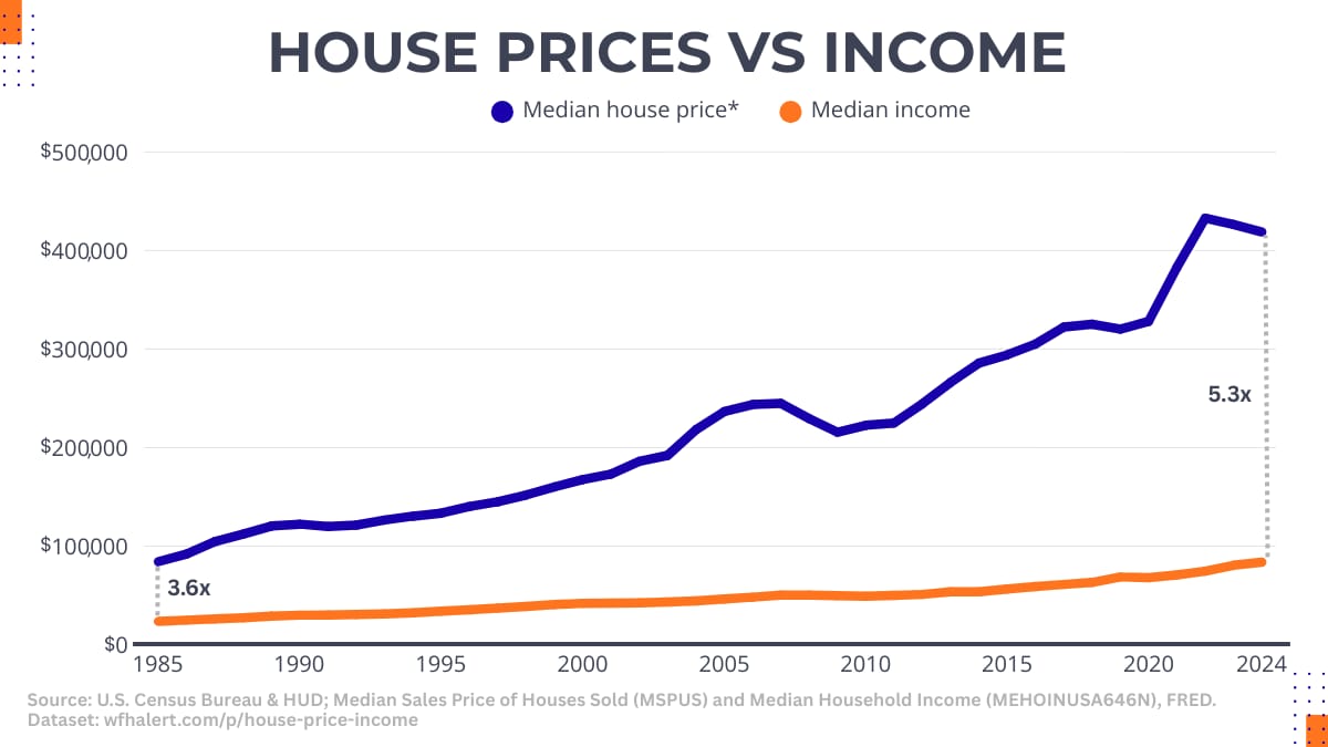 1/ Today we look at long term data on U.S. house prices and household income, and the divergence between the two is striking. Since 1985, both have risen steadily, but home prices have accelerated much faster, widening the affordability gap.