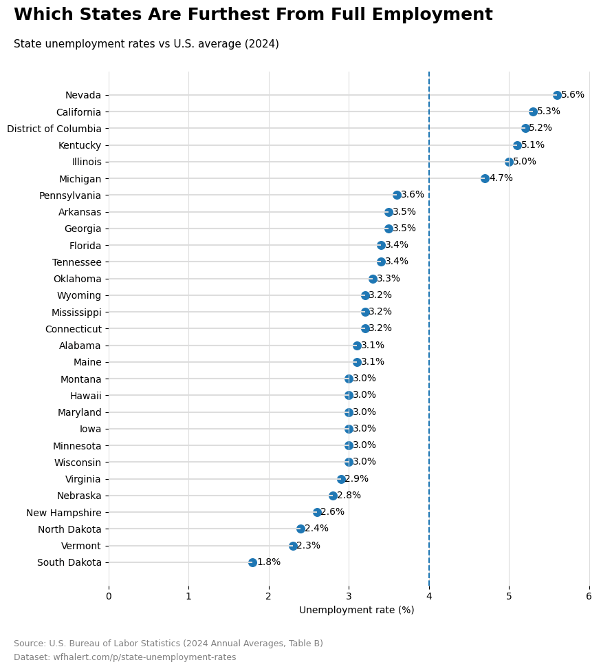 State unemployment rates show a clear divide across the U.S. in 2024. While the national average sits around 4.0% / rate, several states remain well above this benchmark, signaling uneven labor market recovery.
